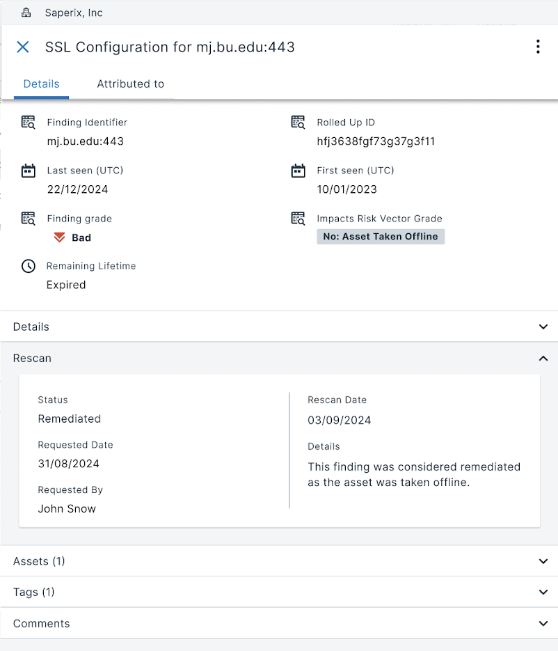 The user interface now provides transparency into whether or not the rescan has occurred, and once it has it provides a link between the old and new finding data. Most importantly, it offers issue tracking that shows whether findings from the previous scan were remediated, partially remediated, or still unresolved upon rescan. So far we’ve heard overwhelmingly positive feedback from customers around this change, as it has improved transparency and ease-of-use of Bitsight products.