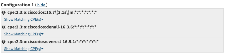 This second type of CVE is more difficult because we need to implement our own version comparison framework to accurately determine if a CVE applies to a specific version. For most products this is pretty straightforward, but for products such as Cisco IOS this can be a headache. Version comparison is often complicated by the fact that version ordering can be ambiguous, such as Atlassian Bitbucket version 7.6.19 is actually a newer version than 7.22.0. Companies will also switch the version scheme such as Adobe Coldfusion going from version 11.0 to version 2016. Another example is CVE-2018-15377 which has the CPEs shown below: