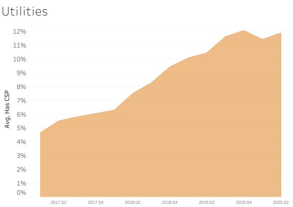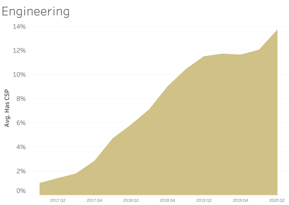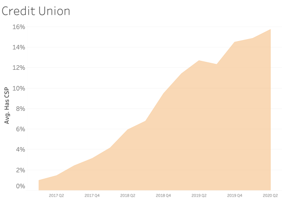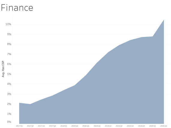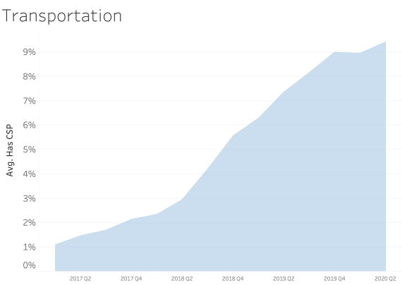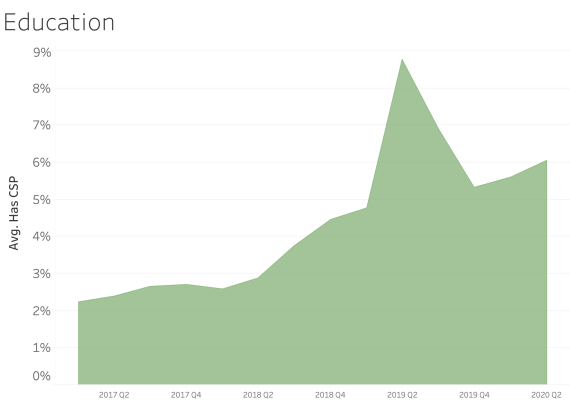 In examining CSP presence by industry sector, most sectors appear to adopt CSP at a similar rate over time. We see consistent and steady adoption rates of CSP across all of the sectors that Bitsight tracks.
