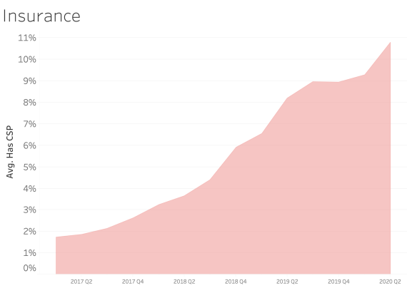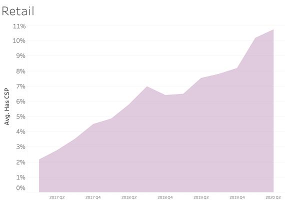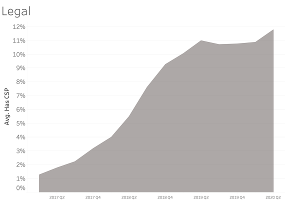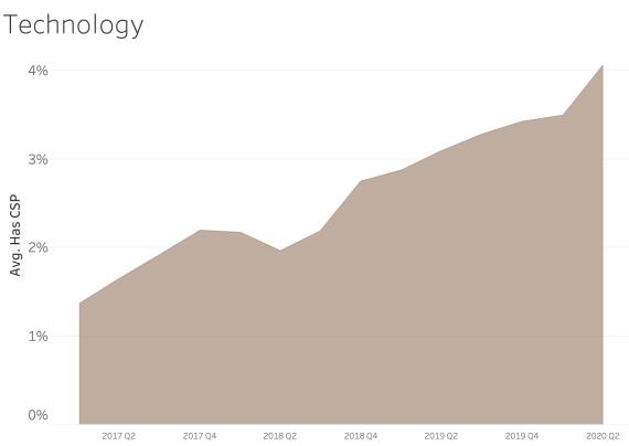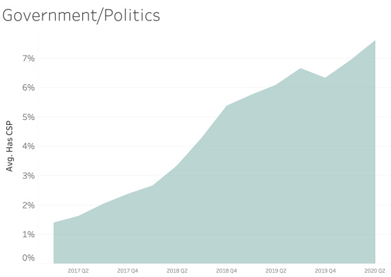 Some of the best known domains and leaders on e-commerce, paying services, social media have a large ratio of CSP presence. We also observed that some of the companies that saw a large influx of global usage during the pandemic have responded to implement CSP.
