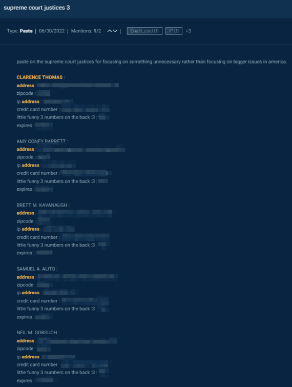 The most notable dox was uploaded on June 30. It alleges to contain physical addresses, IP addresses, and credit card information, including CVV and expiration date. It was uploaded to an underground site intended for doxing.