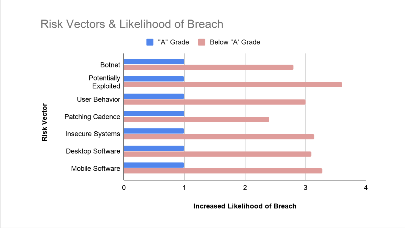 An “A” grade is typically assigned a breach likelihood of 1, while a lower grades reflect the increased likelihood of the vector resulting in a breach. So for example, an organization with a lower grade in User Behavior is 3x more likely to suffer a breach via that vector than a company with an A.