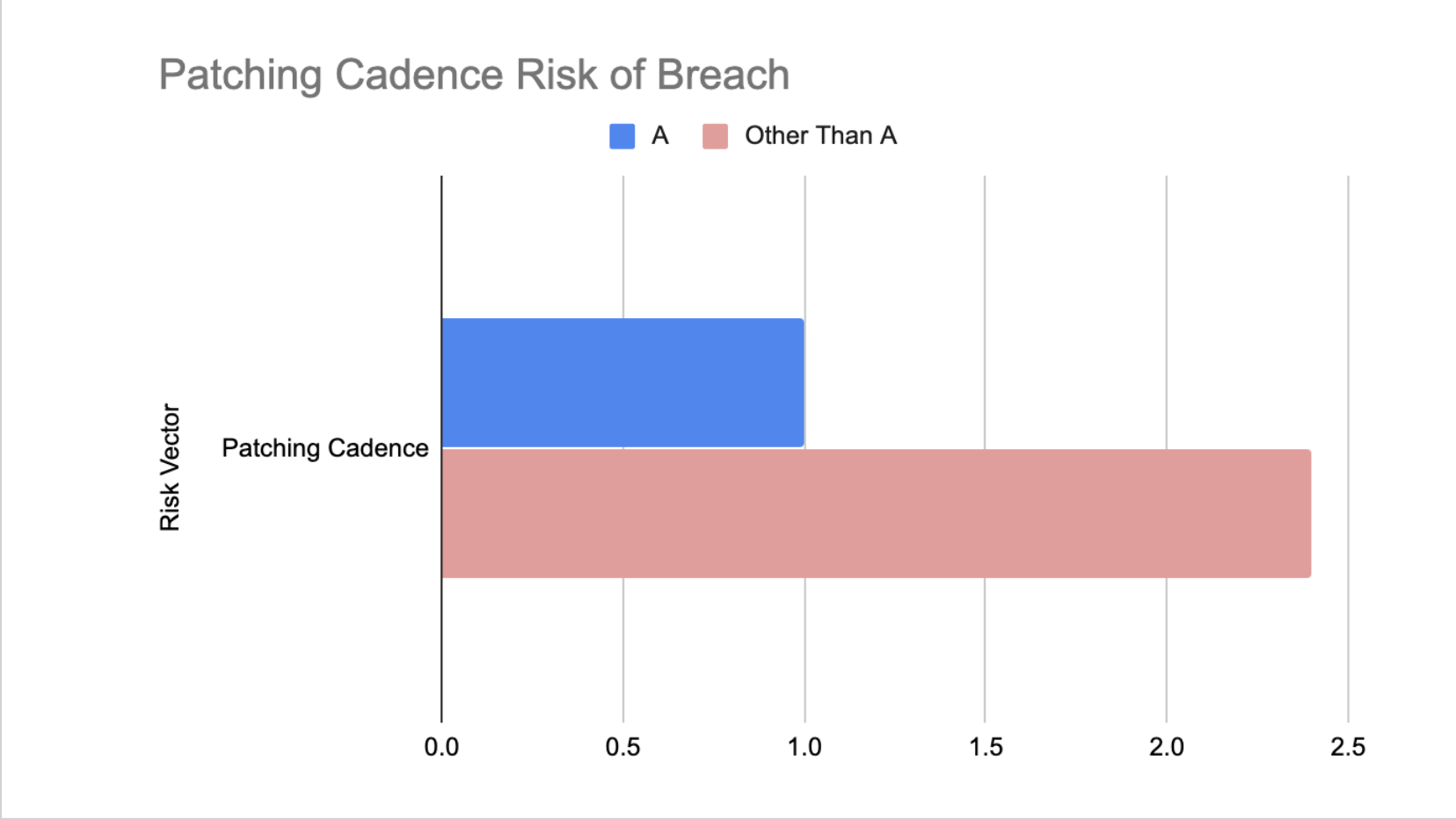 Unlike a security rating, Bitsight grades risk vectors-- the externally observable factors that are indicators of an organization’s security hygiene-- on an A-F scale. Generally, the lower the grade, the greater the likelihood of that factor being a vector for a security breach. Periodically, we compute the probability of a company experiencing one or more data breaches if they have a given grade for the risk vector in question.