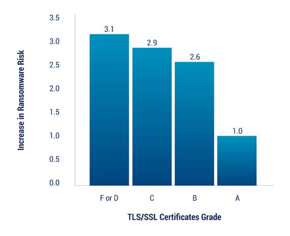 Bitsight’s TLS/SSL Certificates risk vector measures whether a company has properly obtained and deployed TLS/SSL encryption certificates that are used to secure communication over the Internet. Bitsight finds that organizations earning less than an A in this risk vector are approximately 3 times as likely to experience a ransomware incident.