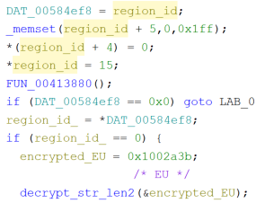 For the campaign ID (or logical botnet ID), also known as region code, It’s not a string but rather an integer that is later mapped to a string. Figure 10 shows the region ID being set to 15, which corresponds to region code WW_11. This configuration value is harder to programmatically extract since one has to find the global variable being set before the first region code string on the main function and then find the integer value to which it is being set to. There are currently 34 region codes, which can be found on the malware strings.