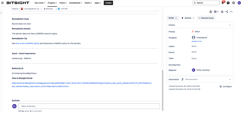 All of this information, including the specific steps needed to remediate the issue, are then visible right in the Jira ticket when the assignee is ready to act on the request. They can also optionally follow a direct link to the full security finding details in the Bitisight portal if desired.