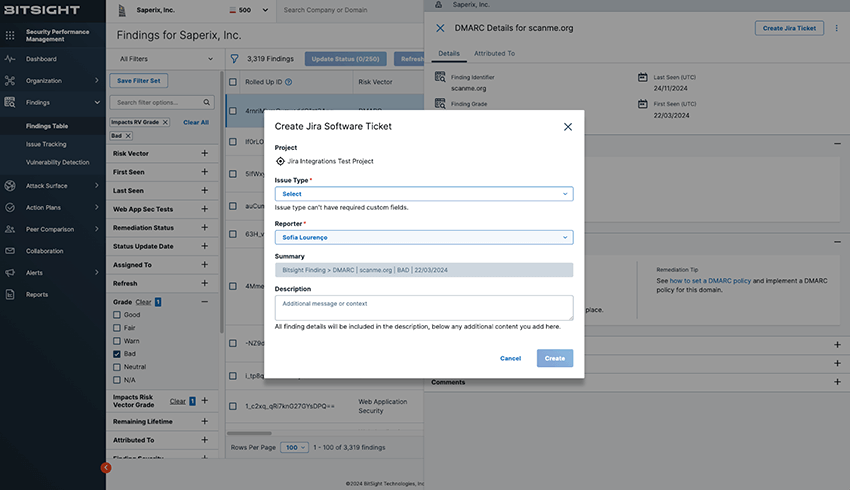 Once the Jira integration is enabled, any authorized Bitsight user viewing a security finding can generate and assign a Jira ticket automatically right from the Bitsight portal.