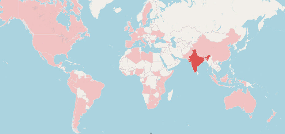 The top 10 most affected countries are, in order, India, Brasil, Colombia, South Africa, Bangladesh, Argentina, Angola, United States, Suriname, and Nigeria.