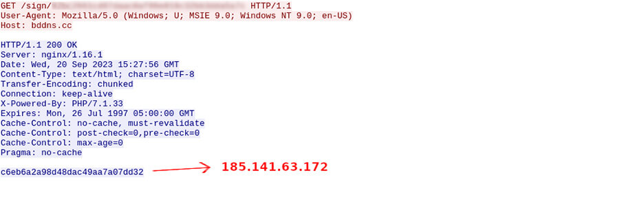 If the bot is unable to get a valid command and control server address using that method, it will send a HTTP GET request to bddns[.]cc to the following endpoint /sign/<rc4 data hex encoded>. The hex encoded data is the result of encrypting a string with the format using RC4 with the key heyfg645fdhwi. The response is also hex encoded and encrypted using the same RC4 key and contains the IP address of a valid command and control server.