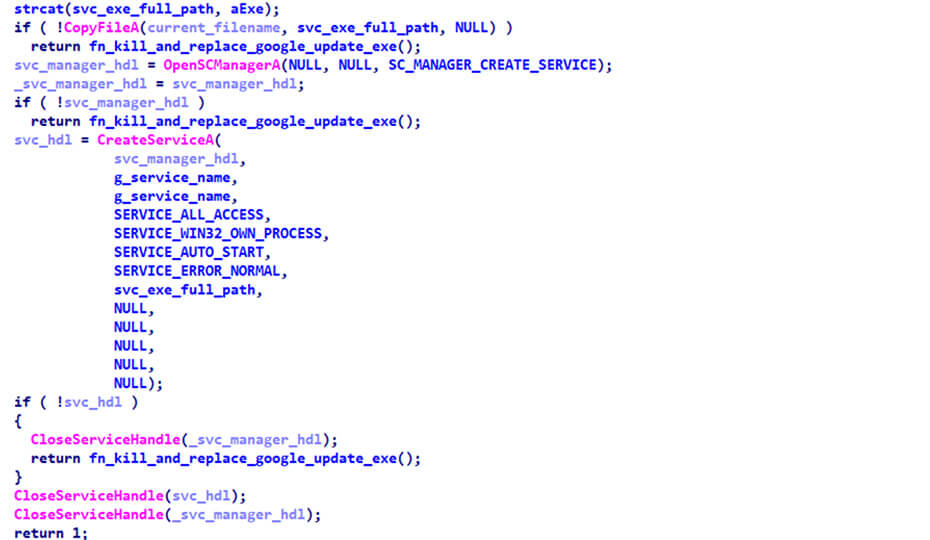 If file copy or service creation fails, the loader will try to kill all Google update processes and replace the GoogleUpdate.exe original executable by itself.