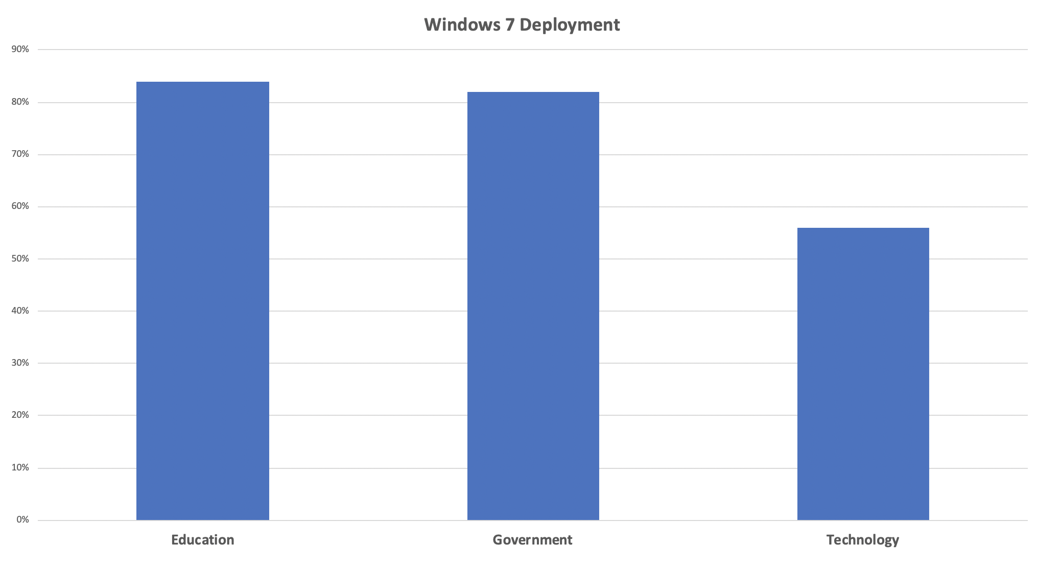 Only the education and government sectors have a Windows 7 deployment rate above 80% (education is 84% and government is 82%). Conversely, technology companies have the lowest Windows 7 deployment rate, and technology is the only market where the rate is under 60% (56%).