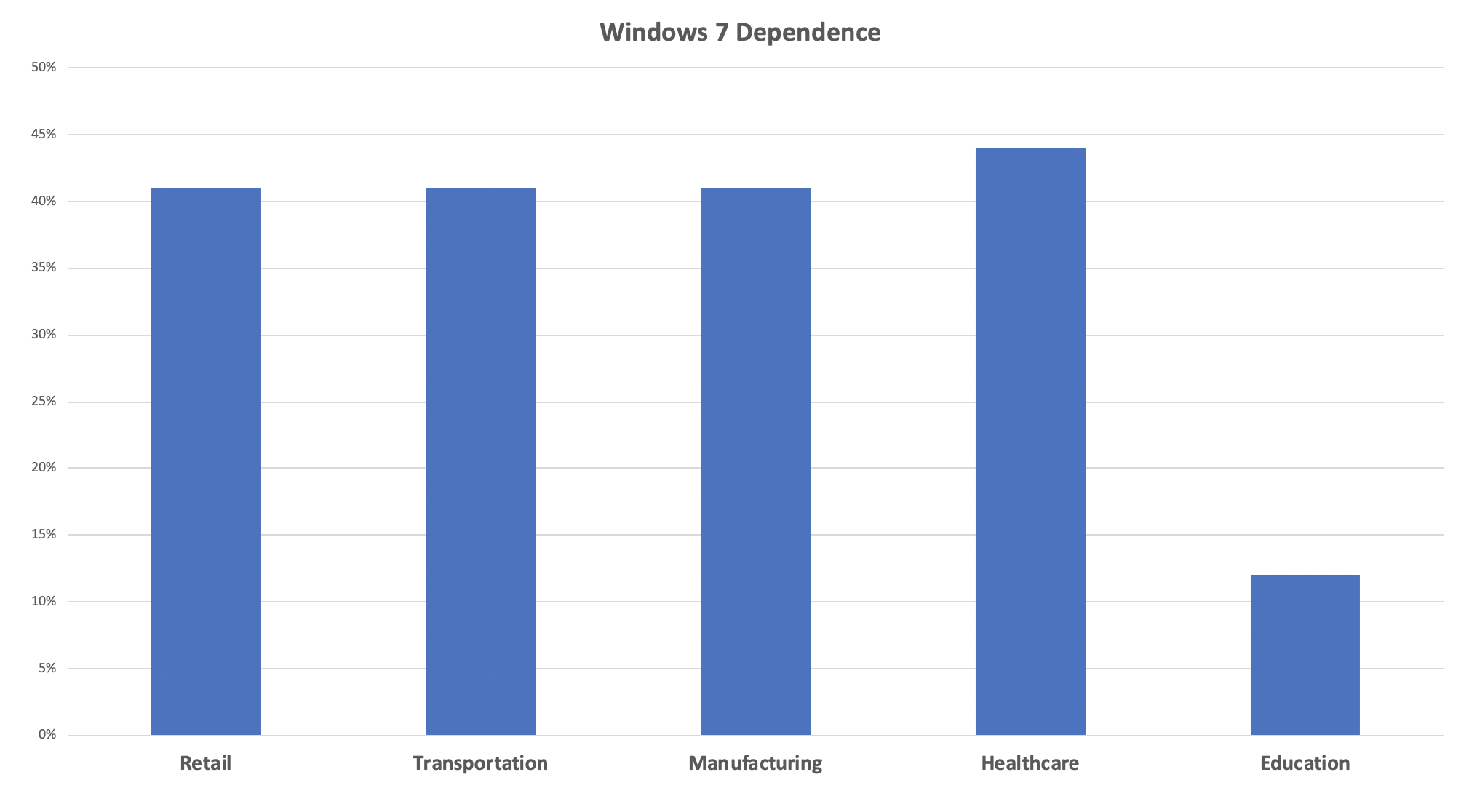 Organizations within retail, transportation, manufacturing, and healthcare industries have a greater dependency on Windows 7.