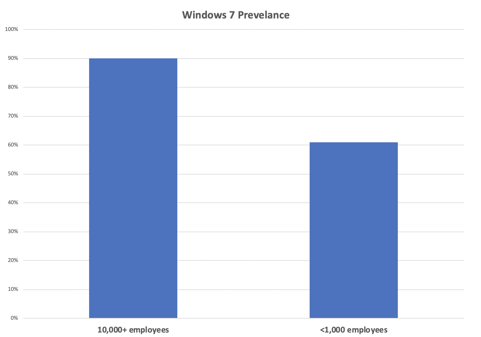 Nearly 90% of organizations with more than 10,000 employees are running Windows 7 on at least one computer, versus only 61% with less than 1,000 employees.