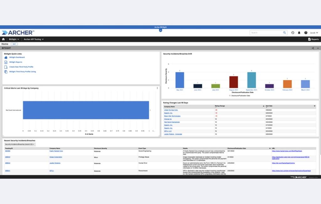 Connecting with Bitsight on the Archer platform enables powerful efficiencies around third-party risk management. The Bitsight dashboard within Archer makes it possible to: