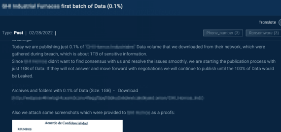The post claims that about 1 TB of sensitive information was stolen, and since the victim is not cooperating with ransom demands, the group will begin publishing its data until it is paid. Creating a feeling of a ticking time bomb, the post includes a link to 1 GB of stolen data.