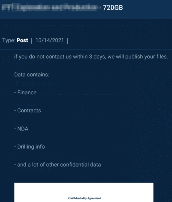 Similarly, this ransom demand from a different group threatens to release 720 GB of stolen data, which includes financial, contractual, and operational information, unless the victim contacts the ransomware group. The post includes several screenshots of documents to prove the authenticity of the threat.