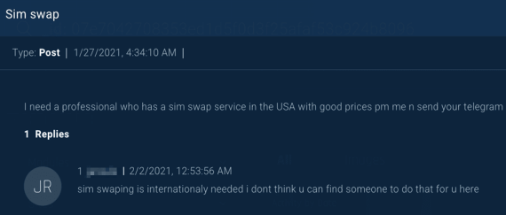 In this final example, an APT we profiled earlier looks for a SIM swap service. In a SIM swap, the attacker gains control of the victim’s phone number, thus enabling them to intercept reset passwords or one-time security codes from banks, cryptocurrency exchanges, and other financial institutions and personal accounts. The need for SIM swapping services may indicate the next attack vector that will be used by this group. Indeed, noting that they specialize in banking trojans, we might speculate that they need one-time passwords to access and cash out accounts whose passwords were compromised by their malware.