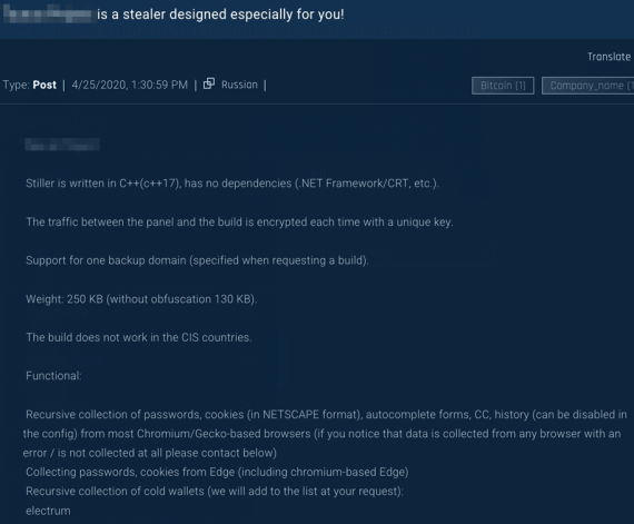 The post below features malware that the actor describes as “a web-based and multifunctional stealer.” The malware costs $40.