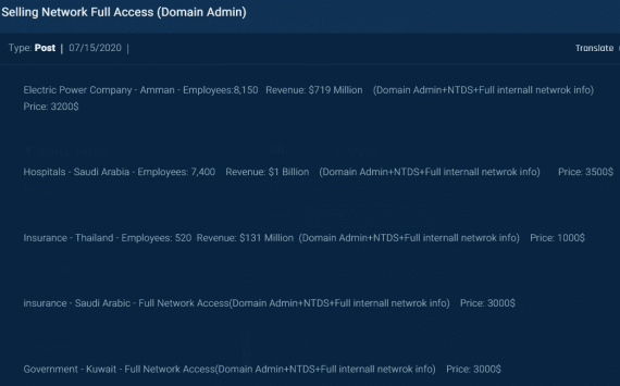 In the post below, a threat actor sells full network access, including domain admin privileges to various organizations. These include an electric company, a hospital, and an insurance company.
