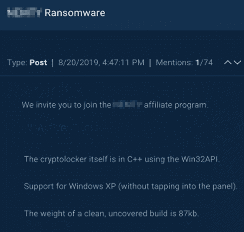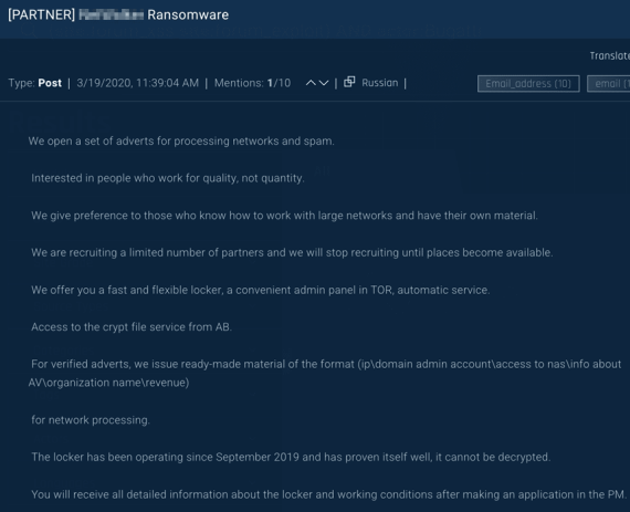 In the next example, an APT seeks affiliates for a well-known ransomware program. The actor notes that the ransomware is “fast and flexible,” uses “a convenient admin panel,” and works automatically. However, not everyone will be accepted; partners will be vetted, and the group will prefer those with skills and prior experience.