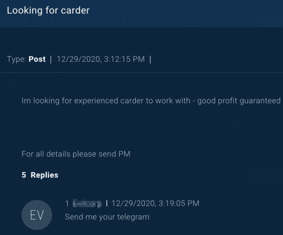 In addition to ransomware, actors seek other professional partnerships. In the post below, an actor writes that they are seeking an experienced carder, meaning an actor specializing in procuring compromised credit cards. In response, the actor behind a known APT simply responds, “Send me your Telegram.” In this simple exchange, someone looking for credit cards is connected with a notorious group specializing in procuring them. If this partnership succeeds, both parties stand to profit.
