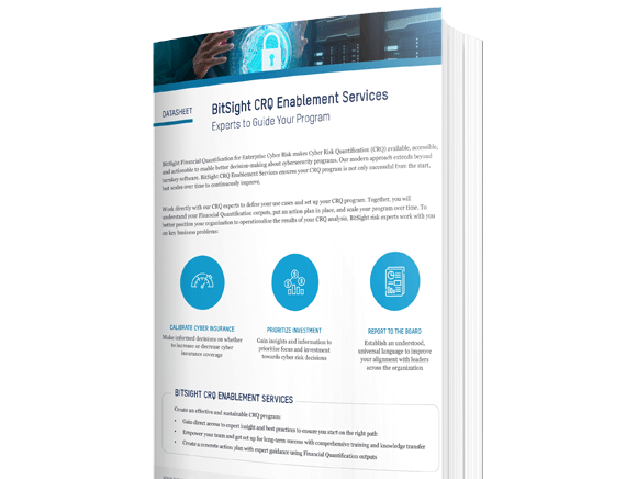 Bitsight CRQ Enablement Services ensures your cyber risk quantification (CRQ) program using Financial Quantification for Enterprise Cyber Risk is successful from the start and scales over time to continuously improve. Download our datasheet to learn more about our CRQ Enablement Services to help you calibrate cyber insurance, prioritize investment, and report to the board.