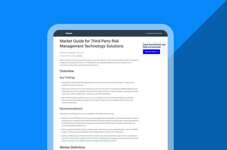 Third-party risk is growing more complex and most organizations now rely on multiple tools to manage it. For GRC teams, finding the right mix of technology can feel overwhelming. That’s where we think that the latest Gartner Market Guide for Third-Party Risk Management Technology Solutions helps you cut through the noise.